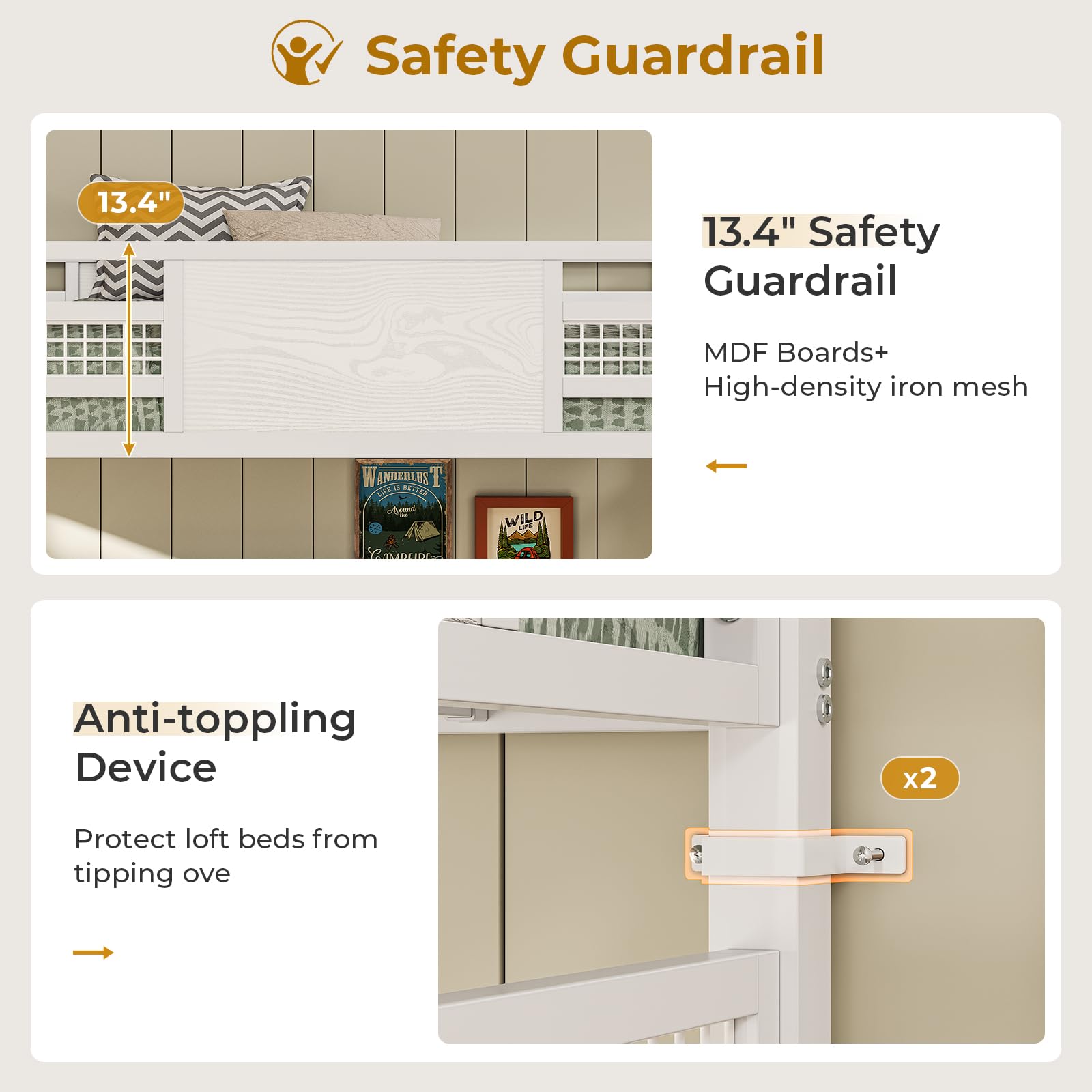 - The top bed is protected on all sides by full-length raised guardrails (MDF boards + high-density iron mesh), which prevents the bed from falling over when it is turned over. In addition, anti-tilt nails securely fasten the bed to the wall for added safety.
